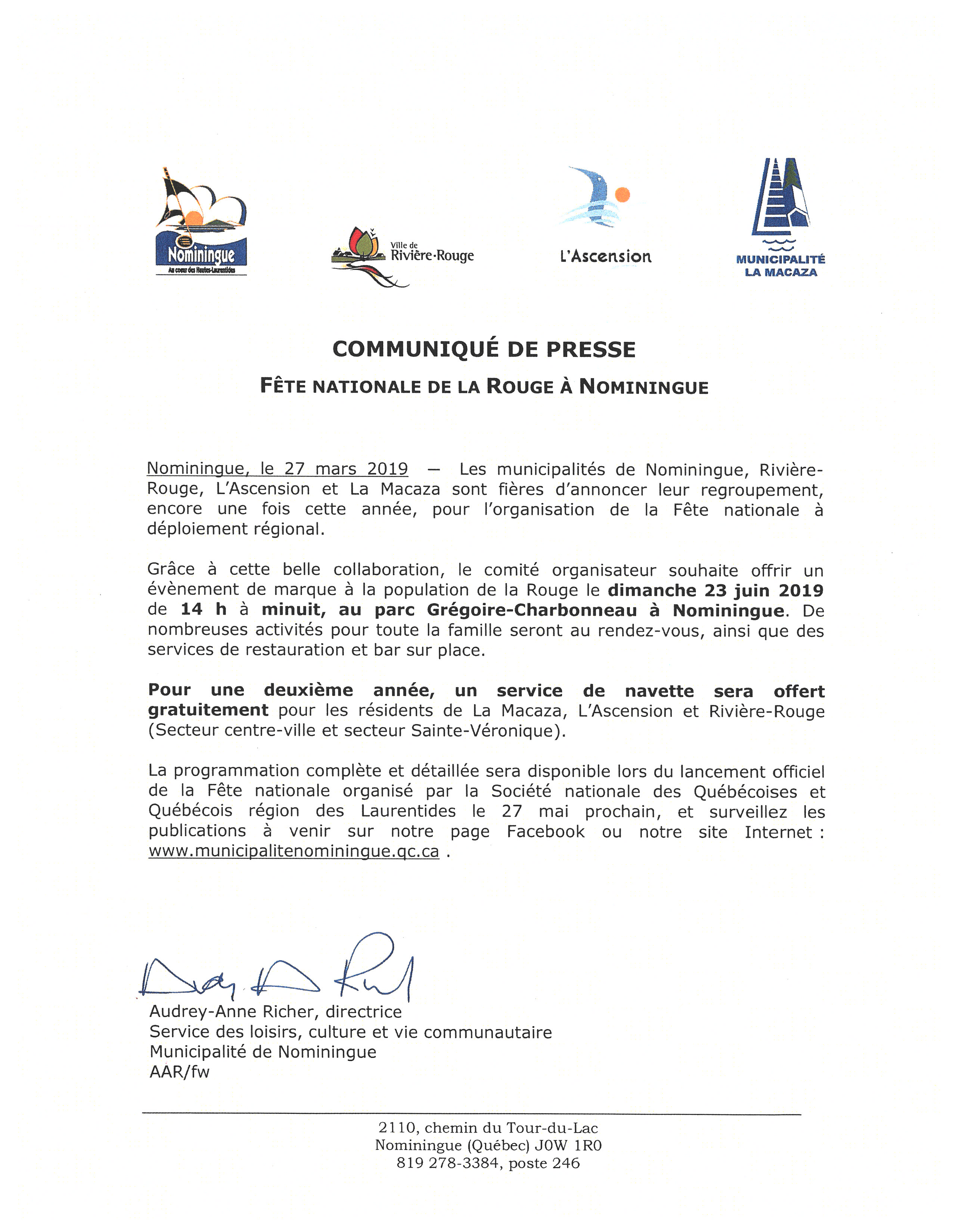 Fête nationale: collaboration des municipalités de Nominingue, Rivière-Rouge, L'Ascension et La Macaza!