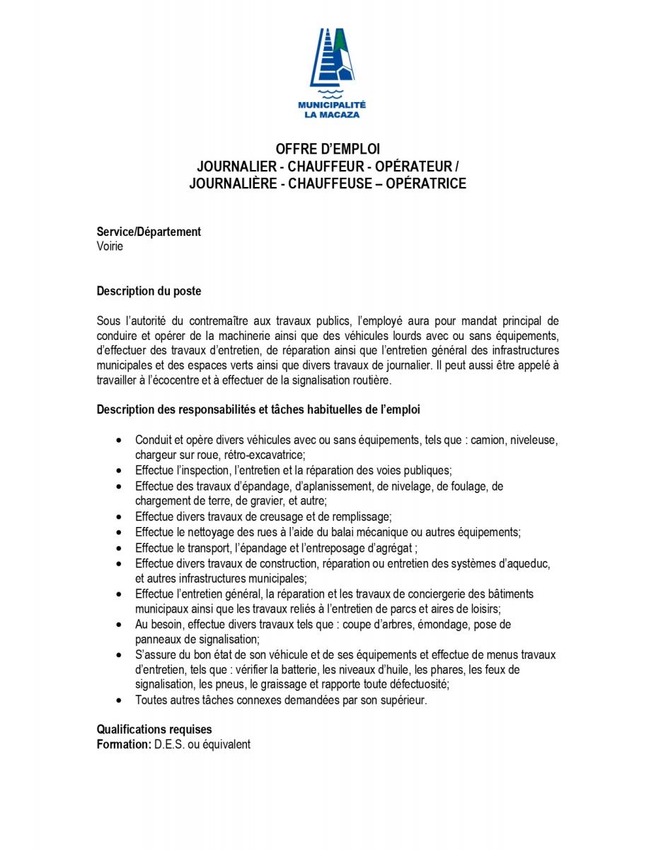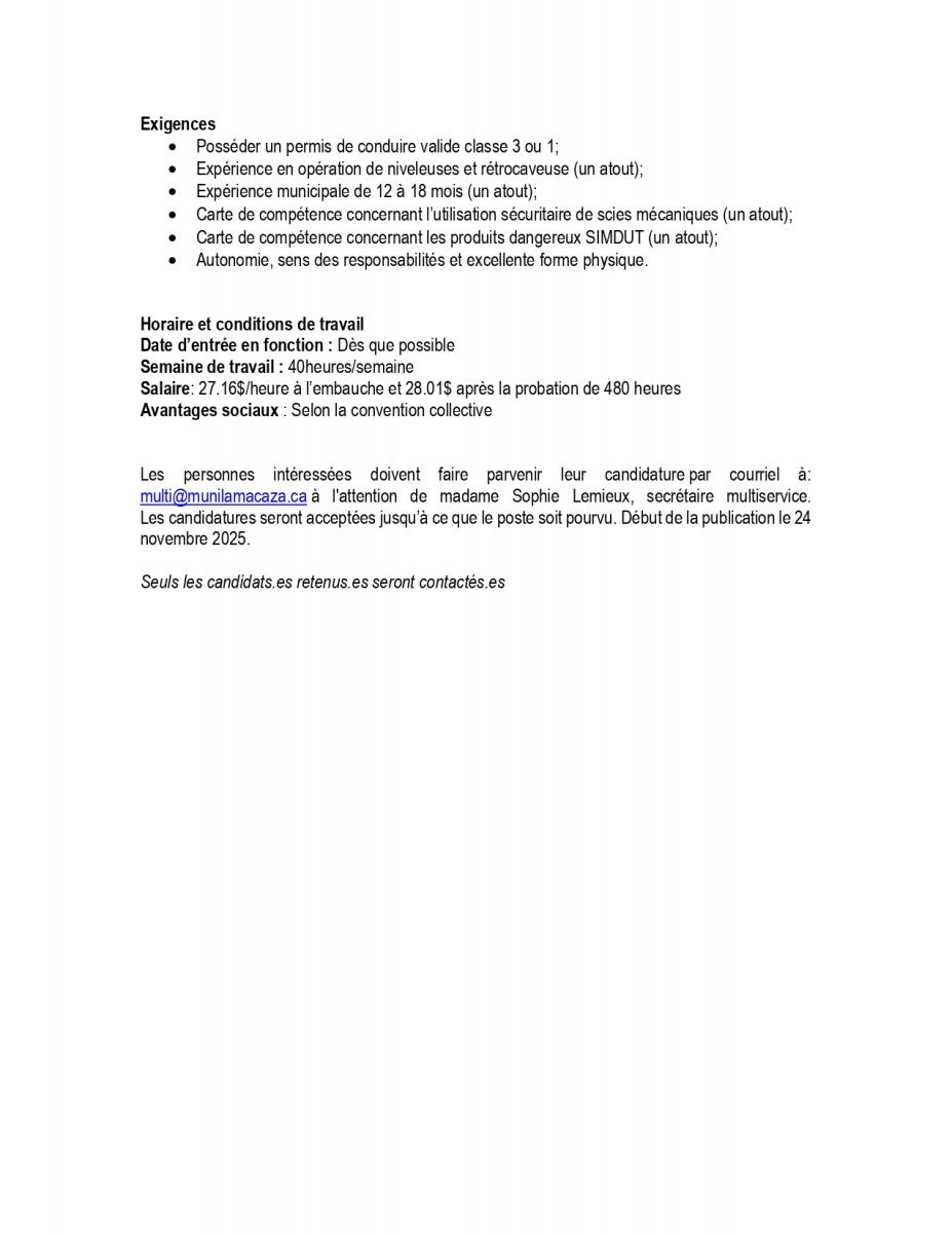 La Municipalité de La Macaza recrute : JOURNALIER-ÈRE / CHAUFFEUR-EUSE / OPÉRATEUR-TRICE